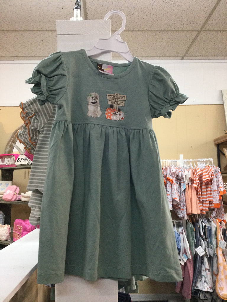 Green Short Sleeve Dress with Pumpkin and Dog Applique