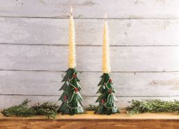 Hand-painted tin tree taper holder with LED lights. Requires 2 AAA batteries, not included.