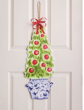 Wooden door décor with hand-painted detail, tin bow and jute rope hanger.