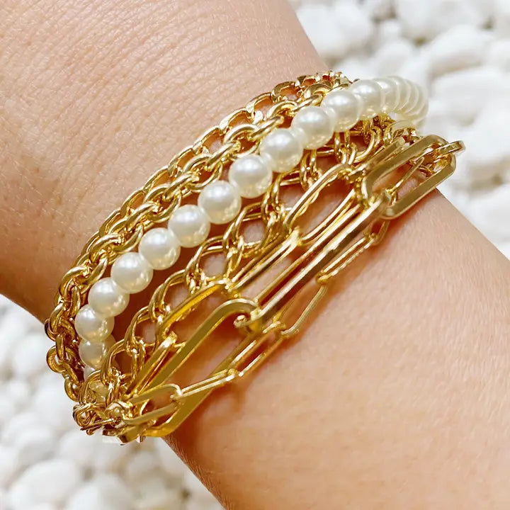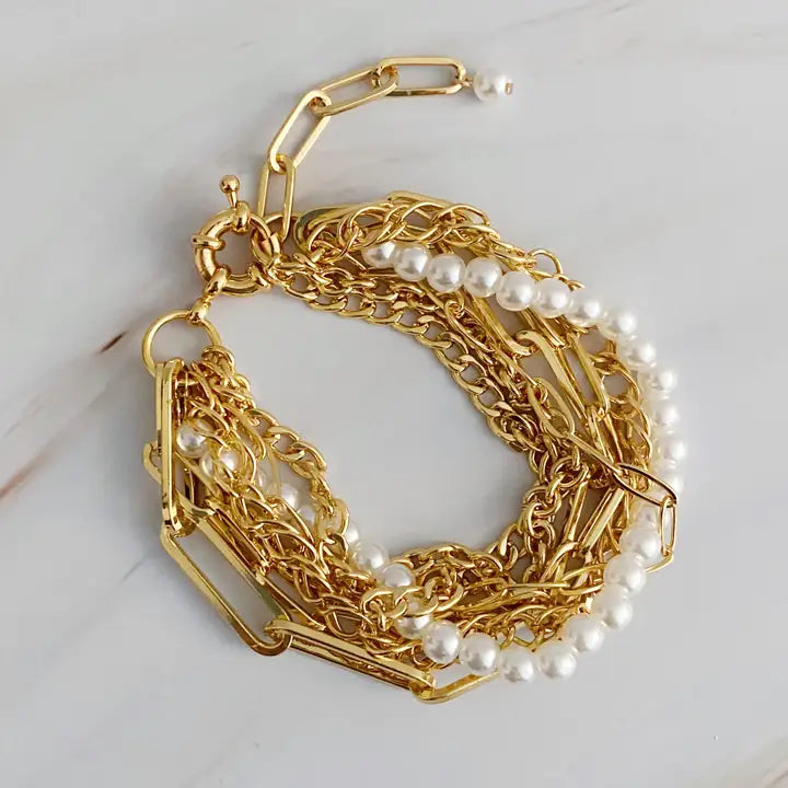 Trendy chains are all together here to make a fun statement piece with a strand of pearls. Dimensions: 7” chain with 2” extender 18k gold plated alloy metal, acrylic pearls Lead and Nickel compliant