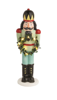 Hand-painted ceramic nutcracker holds light-up faux wreath. Batteries included.